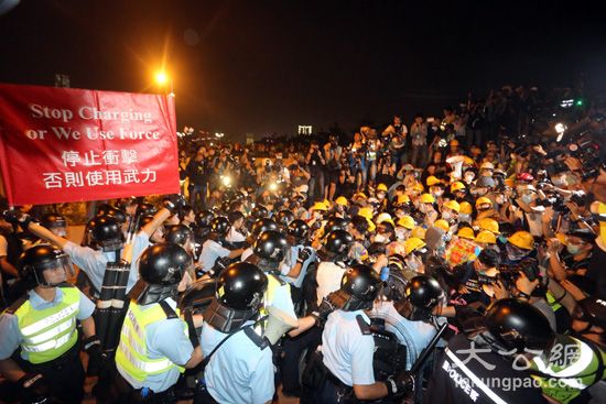 大公网12月1日讯(记者 龚学鸣) “占中”无以为继,死硬派垂死挣扎!学联及学民思潮昨晚宣布将行动升级,大批示威者暴力冲击政府总部,重占龙和道,向政府宣战,向法治宣战。警方重兵布防,严阵以待,攻守战术层次分明。双方在添马公园通往特首办的行人道及立法会对开的龙和道,爆发多次激烈冲突。各界强烈谴责双学反政府、反民意的行为。学联呼吁示威者守到今日早上上班时间,以瘫痪政总运作。至本报截稿时,围堵政总的示威者仍未散去。今日凌晨1时40分左右,警方驱散龙和道示威者,将他们赶返添马公园。