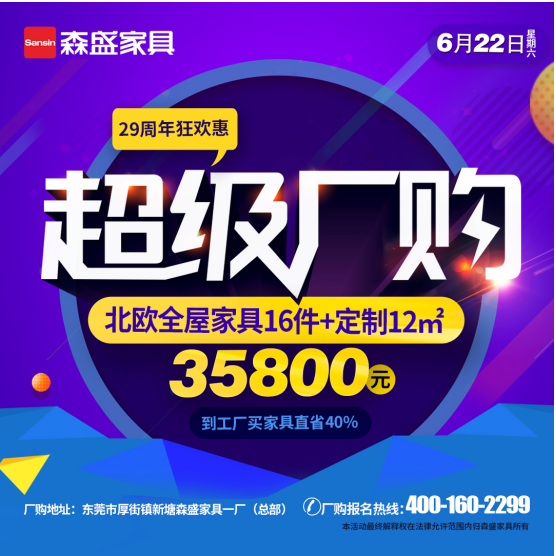 为庆祝公司成立29周年,森盛家具大型超级厂购将于6月22日在森盛总部拉开帷幕!八大主流风格+全屋定制、4000平米展厅上千款品牌家具低价任性抢!上万豪礼等您拿,超多福利和优惠为您在盛夏带来年中福利。