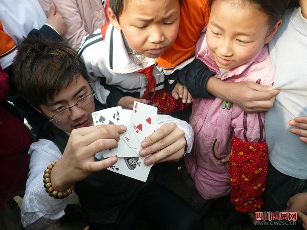 下午,志愿者们刚来到校门口,就被孩子们团团围住,一大群喜爱魔术的“粉丝”们簇拥着欧阳老师进了校园。欧阳老师没有辜负同学们的期待,现场表演了多个精彩的魔术,熟练的手法,奇妙的效果,看得同学们个个目瞪口呆,纷纷围着欧阳老师,想学几手绝技,看到同学们对魔术如此喜爱,欧阳老师当场表示要在学校里组织成立一个魔术兴趣小组,利用孩子们周末或课余时间,义务教同学们一些简单的魔术技能。魔术表演过后,志愿者还和同学们一起在操场上举行篮球友谊赛。