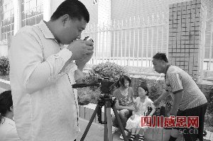 马路上,韩依笑的两只大脚踩着一双蓝色的拖鞋大步行走,挂在肩上的袋子装着三脚架,像是一只剑匣。跟在身后的黄家人,无助地坐在协和医院对面的花圃围沿上。韩依笑架好三脚架,从包里掏出DV架好,再次“创作”。此时,身材高大、胖圆脸的他,眼睛眯成了一条缝,脸几乎是贴着DV显示屏观看(见图)。
