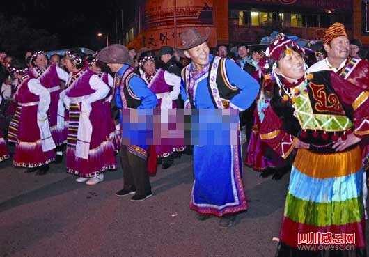 14日晚,绵阳普明社区数百位居民围着熊熊燃烧的篝火,与来自北川的羌族客人一起跳起欢快的羌族舞蹈萨朗,共迎新春佳节。