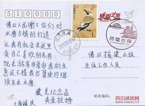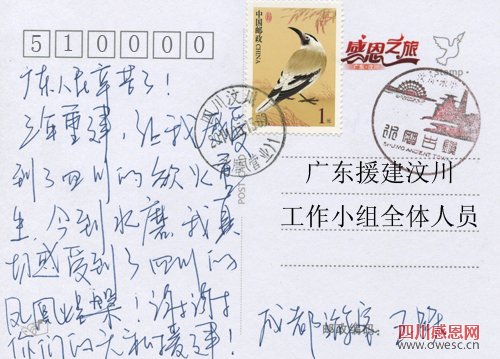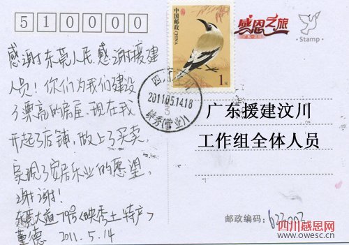 四川新闻网珠海5月17日讯(记者 杨可心)在四川新闻网特制的、展示汶川灾后恢复重建成果的、印着“感恩之旅”和“广东·汶川”的明信片上,一句句汶川群众发自肺腑的感谢与惦念写满明信片的背面。