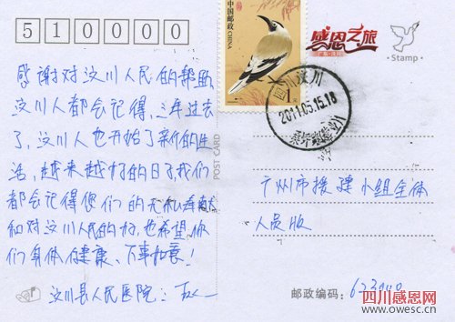 在广州援建的汶川县人民医院的药房里,年轻的药剂师王欢写道:“感谢对汶川人民的帮助,汶川人民会记得!三年过去,汶川人也开始了新的生活,(过上了)越来越好的日子。我们都会记得你们的无私奉献,也希望你们身体健康、万事如意!”