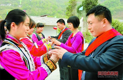 羌红献亲人,羌酒敬亲朋——车到平武县平通镇牛飞村时,羌族汉子赵林听说是 “ 河 北 恩人”,马上给恩人戴上羌红,并敬上自家酿造的羌酒。他对记者说,是河北的援建让他有了新家,过上了幸福的生活。地震中,他的女儿不幸遇难,而前不久,他刚刚又有了一对双胞胎女儿,全家对未来充满了希望。