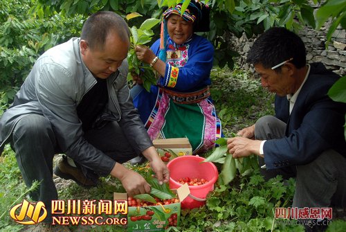 四川新闻网小金5月25日讯(张正英 郑皓南)日前,笔者在美沃乡头道村甜樱桃林中看到,农民正在地头销售樱桃,合作社负责人正在验货、过称、填写收据、包装、收钱……精美的包装盒上印着他们叫得响的名字:小金甜樱桃。
