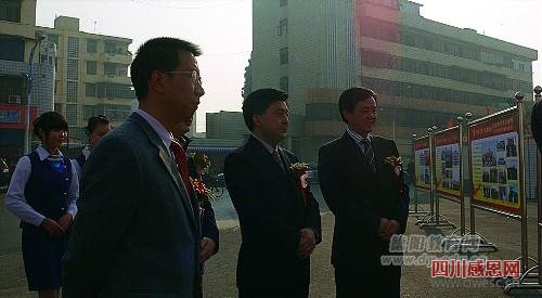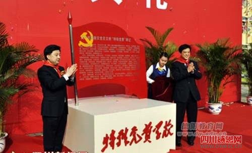 (中共德阳市委组织部部长丁成明和中共广汉市委书记杨波共同为广汉市“七一”学校标识揭幕)