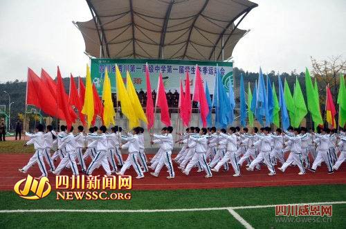 彩旗方队正步走过主席台 四川新闻网青川11月17日讯(陈明晖 记者 李京枝)一年好景君顺记,最是橙黄橘绿时。11月17日,四川省青川第一高级中学(下文简称青川一中)5.12汶川地震以后,建校以来的首届学生冬季运动会开幕。这是一场凝聚人心,感恩奋进的体育盛会。青川县竹园经济开发区管委会副主任陈东出席开幕式,并宣布本届运动会开幕。 在国旗、校旗和会旗方阵的引领下,青川一中38个班级代表队迈着矫健的步伐,斗志昂扬、意气风发,依次列队走进体育场。 在隆重的升国旗、奏国歌仪式后,青川一中党支部书记、校长王海元致辞。他代表学校向各级领导、各位来宾以及辛勤工作、积极备战的师生表示热烈的欢迎和衷心的感谢。他说,本次运动会是对青川一中全体师生精神风貌和综合素质的一次大展示,他希望在校师生要把学习与健身、发展体育运动与增强体质有机结合起来,“文明其精神,野蛮其体魄”! 随后,青川一中学校文艺队的同学们进行了舞蹈《彝族火把节》、《傣族洗衣歌》、《羌族真情永存》,广播体操和健美操等热情洋溢、精彩纷呈的文艺表演。 本届运动会为期三天,青川一中各班级代表队1800余名学生参与到长短跑、跳高跳远等12个体育竞技项目的比赛中。这届运动会的举办,将展示青川一中团结进取、奋发有为的精神风貌,是对青川一中体育教育工作的一次大检阅,也将激励广大师生自立自强以更加饱满的热情积极投入到今后的学习生活。 开幕式前,各班级代表队还气势恢宏地围绕智慧岛教育园区进行了游行表演,展示青川一中师生积极向上的精神风貌。 青川县委宣传部、县文体局、竹园经济开发区管委会等相关部门及各乡镇负责人出席开幕式并观看演出,青云上锰业、天运金属等企业代表参加开幕式。5.12汶川地震后,为了解决青川县青竹江流域学生读高中难,读高中贵,家庭负担重等问题,调整新建的一所全日制普通高级中学,其前身是四川省青川三锅中学。学校位于竹园智慧岛教育园区,由浙江省全额援建。2009年12月18日开工建设,2010年9月1日竣工交付使用。学校的建设受到四川、浙江两省领导的高度重视。党和国家领导人温家宝、李长春先后到学校视察指导。 青川一中自创办以来,全体师生夙兴夜寐,宵衣旰食,按照“一年打基础,三年树形象,五年一大步,九年上台阶”的发展思路,快马加鞭,负重前行。2011年首届高考本科上线率以超额实现下达目标240%的成绩圆满完成。学校荣获广元市高中素质教育质量考核三等奖,青川县2011年高中教育一等质量奖。