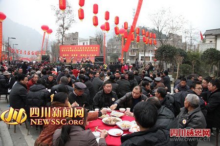 在坝坝宴现场,几百张餐桌铺满了映秀的主街道。除了有映秀镇的居民外,汶川县的每个村子也都选派了村民代表。广场上,人们载歌载舞,穿着藏、羌服饰,敲锣打鼓,欢天喜地迎接八方宾朋,参加坝坝宴喜过元旦。