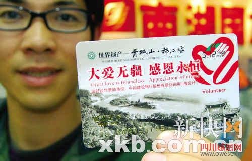 据了解,与“四川地震遗址游”同步推出的,还有由都江堰市人民政府、青城山—都江堰旅游景区管理局共同发行的“5·12感恩卡”。为回馈广东友人对四川的关心、支持和无私援助,都江堰市人民政府、青城山、都江堰景区向为都江堰人民提供过援助、救助、帮扶的爱心人士赠送终生免费游览世界遗产青城山、都江堰景区的“5·12感恩卡”,共计3万张。其中捐款、捐物1000元至5000元的企业,都江堰向爱心企业发放5张感恩卡;捐款、捐物5000元至1万元的企业,都江堰向爱心企业发放10张感恩卡;捐款、捐物1万元以上的企业,都江堰向爱心企业发放20张感恩卡。而捐款、捐物300元以上的爱心人士,捐款、捐物300元以下的年龄60周岁以上及18周岁以下的爱心人士、低保户以及残疾人士均可获得一张感恩卡。即日起,爱心人士凭借相关的爱心证明,到南湖国旅位于广州市内各营业部即可领取感恩卡。