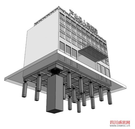 成都商报记者从当年设计专家处了解到,这栋大楼之所以如此“坚强”,其奥秘在于建筑中上部结构与基础之间安装的“橡胶隔震支座”。广州大学公共安全与防灾减灾研究中心主任周云教授参观后感叹:“这是我国首栋经受强震考验的隔震建筑。”这栋楼采用了框架结构体系,总层数为7层,结构抗震设防烈度7度,系澳门特区政府援建项目。如果不是因为院内众多的帐篷,几乎很难看出芦山县人民医院新门诊综合楼(下简称新门诊大楼)刚刚经历了一场7.0级地震。