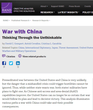 兰德公司是美国重要的以军事为主的综合性战略研究机构。兰德公司的这份题为《与中国开战,想不敢想之事》(War with China—Thinking Through the Unthinkable)的报告说,虽然美中出现预谋战争的可能性不太,但是,一旦危机处理不当,两国的敌意可能被引发,而这一点却不能忽视。
